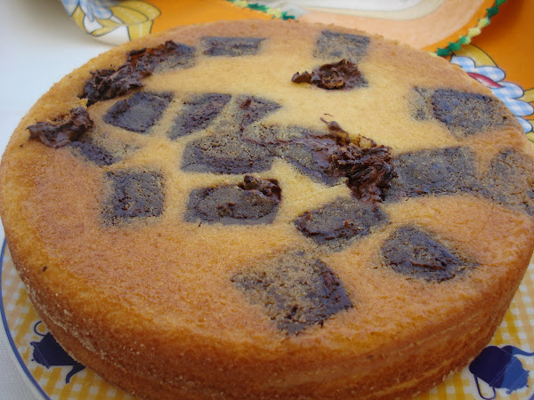Deite a massa numa forma untada e polvilhada e leve ao forno, a 200º, durante cerca de 40 minutos. Ao fim de 10 minutos de cozedura, junte 6 quadrinhos de chocolate. Quando o bolo estiver quase cozido, junte os restantes quadradinhos de chocolate.
